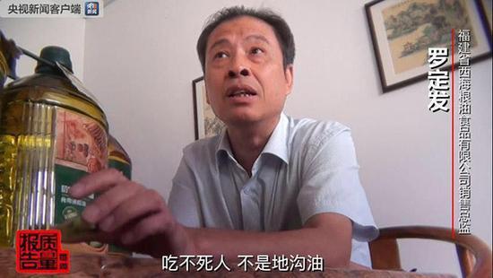 福建省西海粮油食品有限公司销售总监罗定发:万变不离其宗这个意思就是,我们里面的总配方基本上都是差不多的,无非就是写了山茶油,我们一定要放一点山茶油进去,一个是对得起良心,还有一个要经得起检查,说白了就是这个意思。最起码工商检查不会查出问题,吃不死人,不是地沟油,这是最基本的啊。
