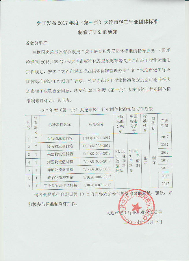 关于发布2017年度(第一批)大连市轻工行业团体标准制修订计划的通知