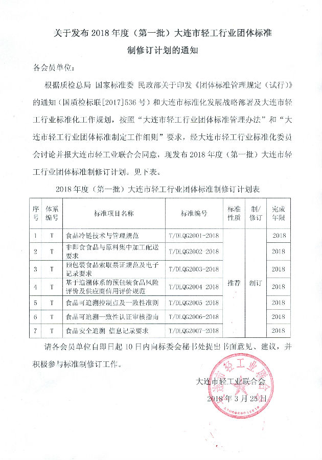 关于发布2018年度(第一批)大连市轻工行业团体标准制修订计划的通知