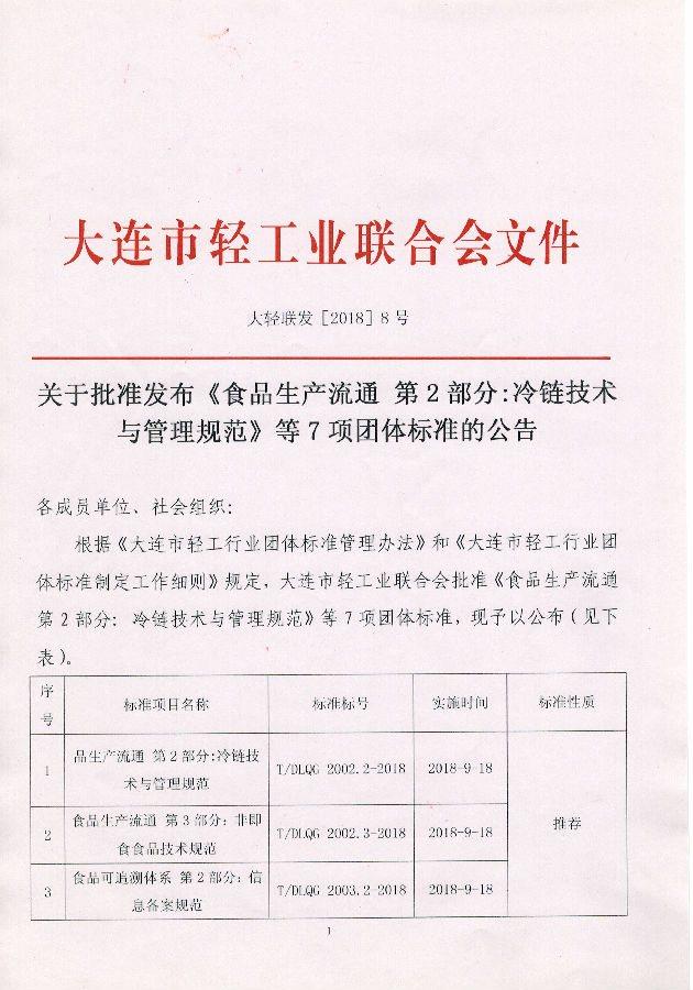 关于批准发布《食品生产流通第二部分:冷链技术与管理规范》等7项团体标准的公告