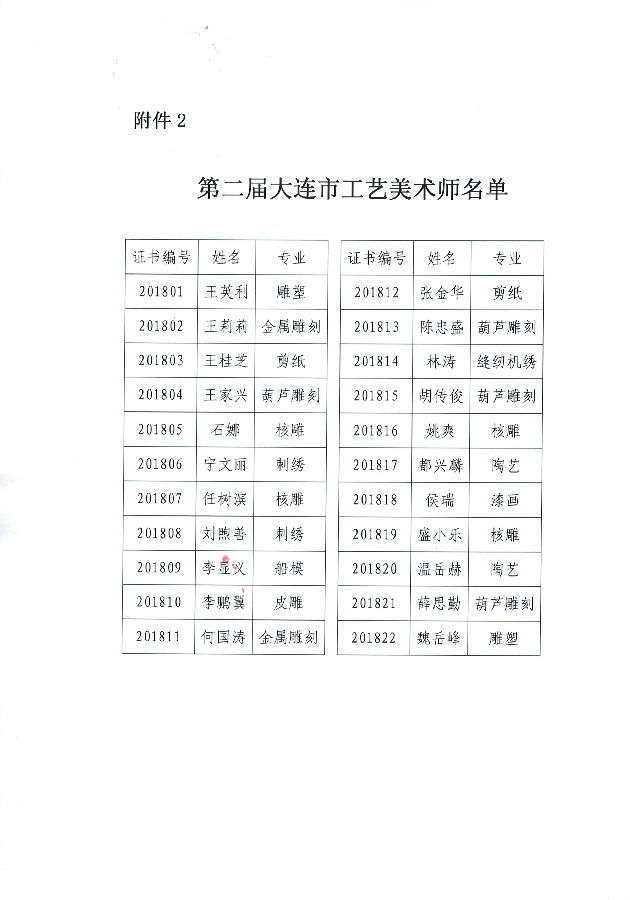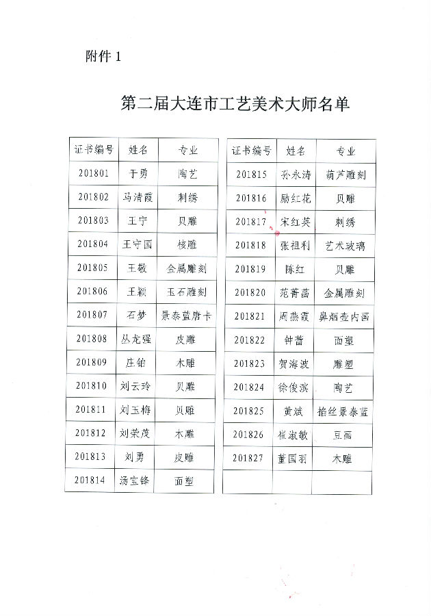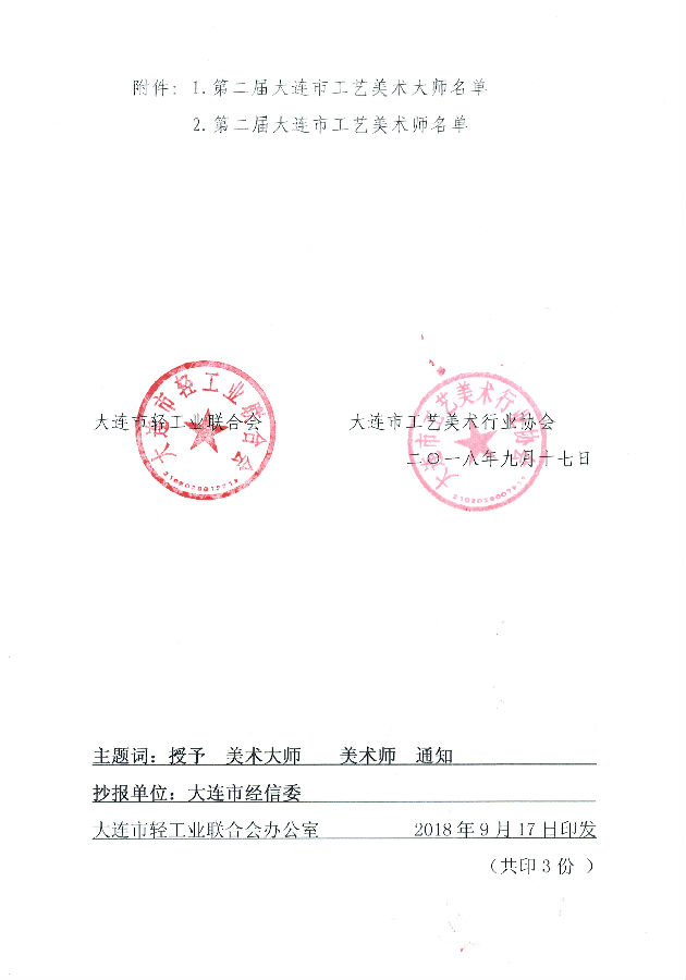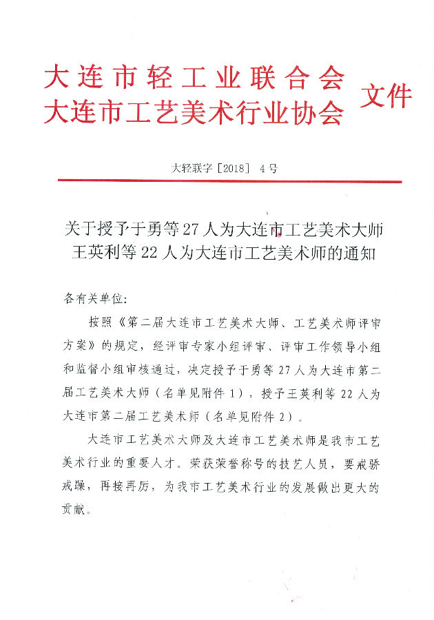 关于授予于勇等27人为大连市工艺美术大师、王英利等22人为大连市工艺美术师的通知