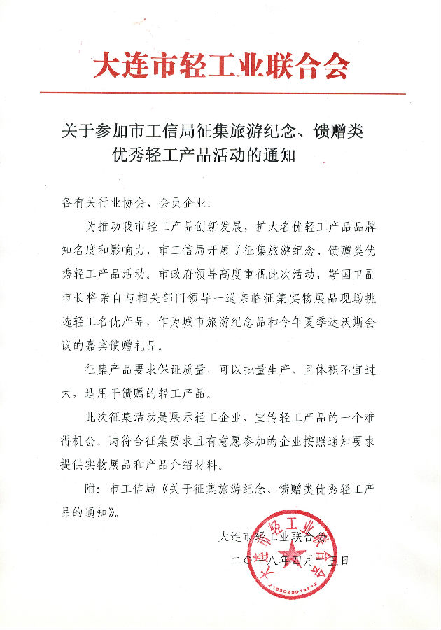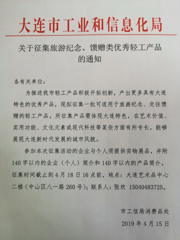 关于参加市工信局征集旅游纪念、馈赠类优秀轻工产品的活动的通知